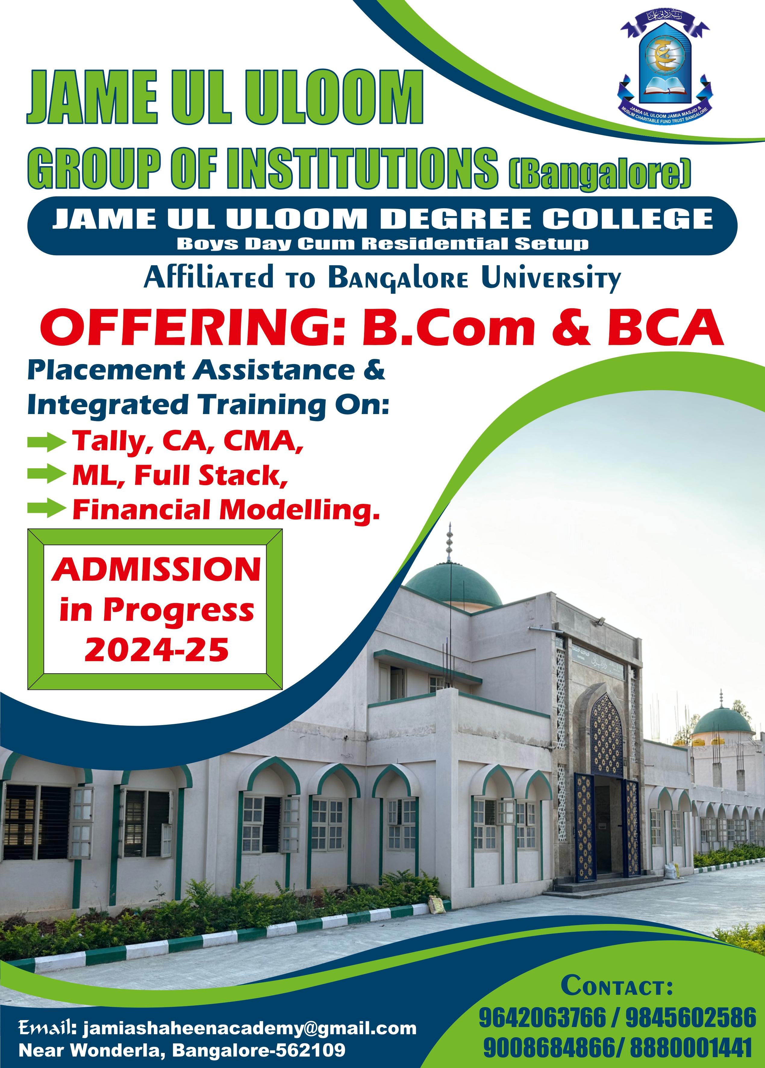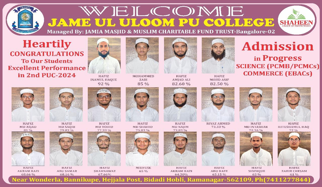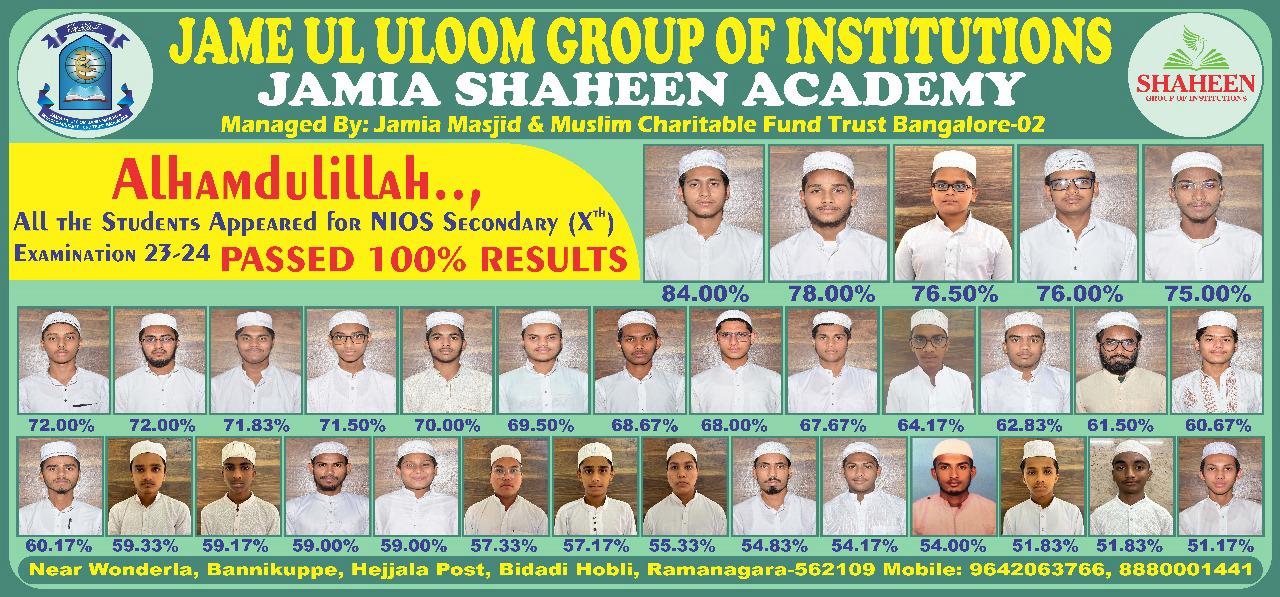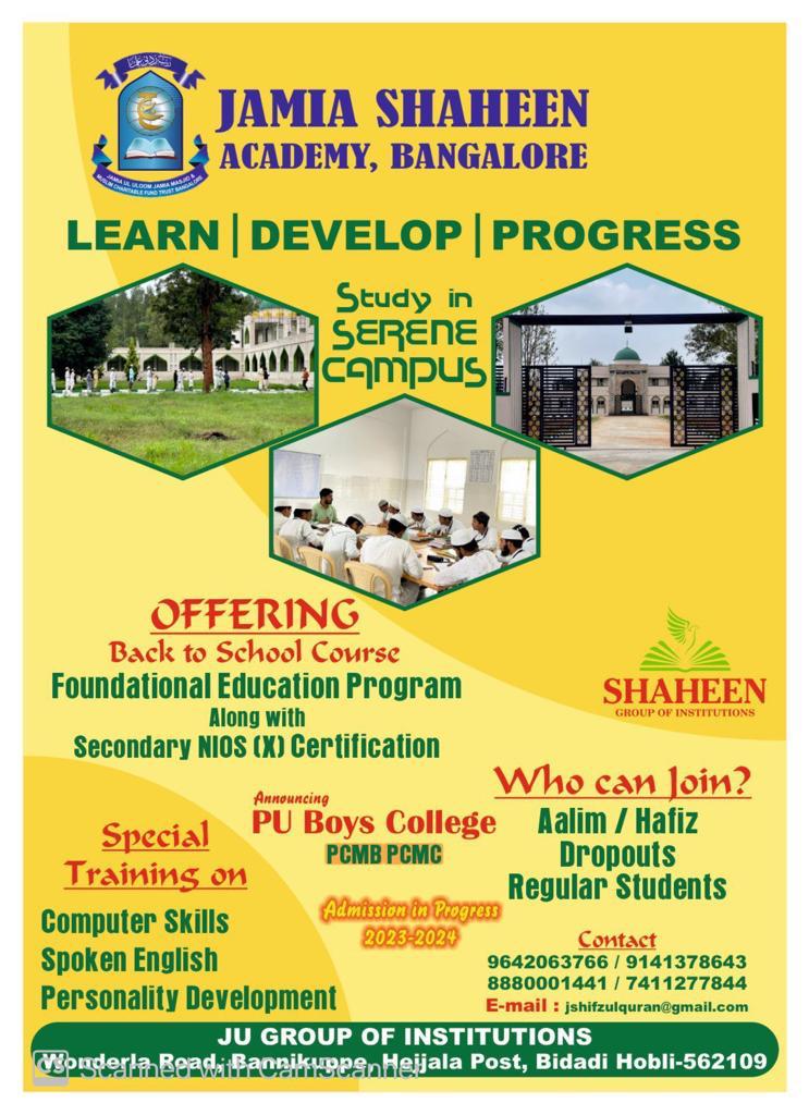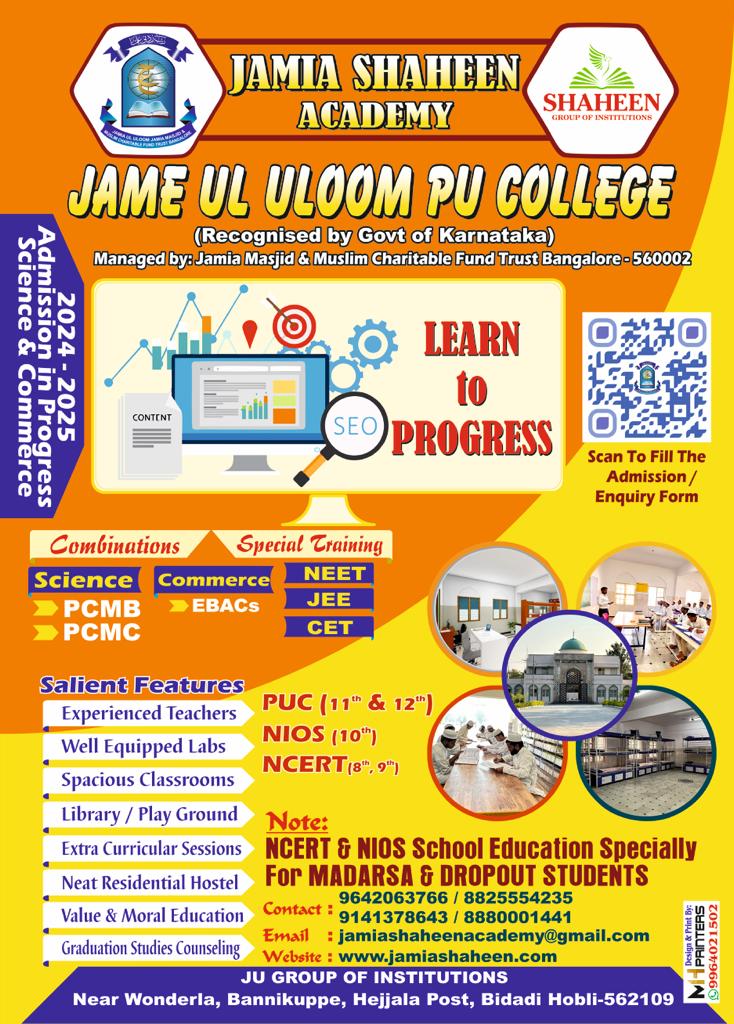 Welcome to Jame ul Uloom Shaheen Academy, a well-designed learning setup that aims to open up school and higher education prospects for '7th+ and 10+2 class/Hafiz-e-Quran/Aalim students'. Associated with the historical Jamia Masjid Bangalore, JSA has been systematically working to impart education among teen and youth aged 13 to 23 years and gradually increase their potential to compete for higher education.