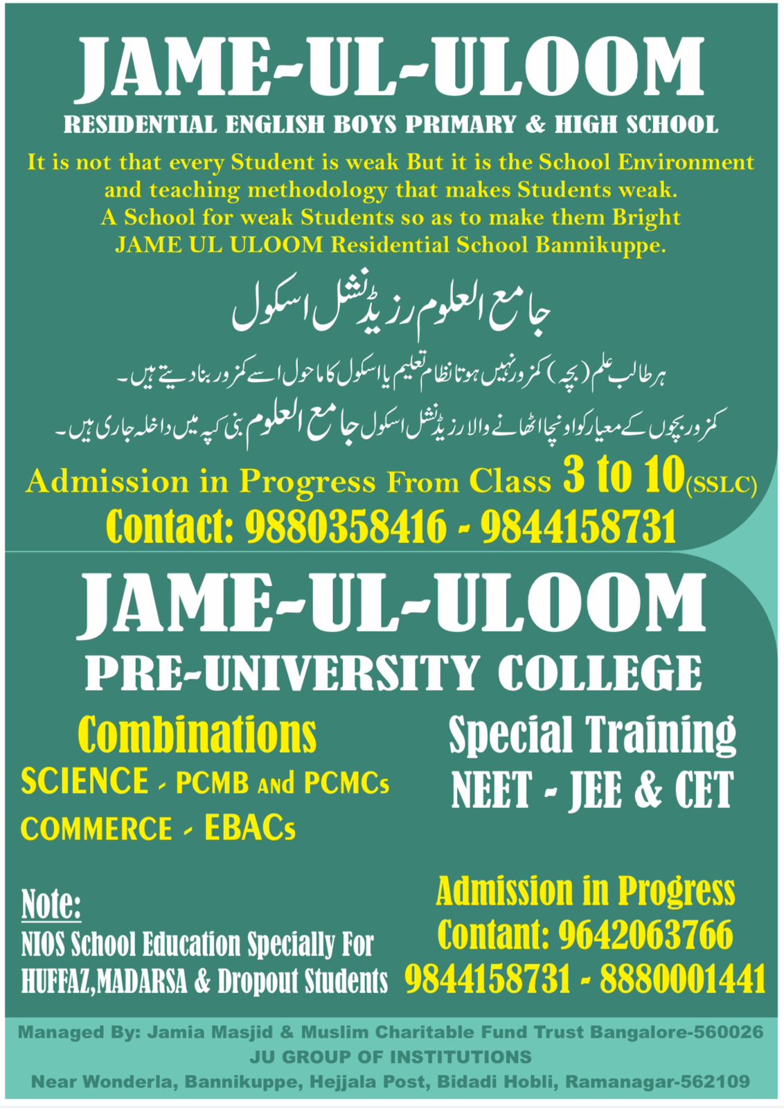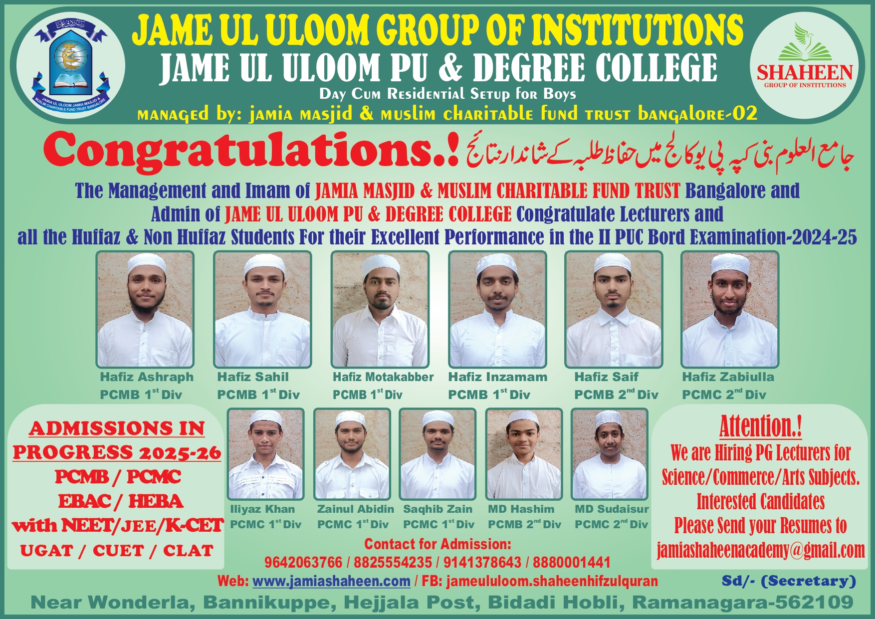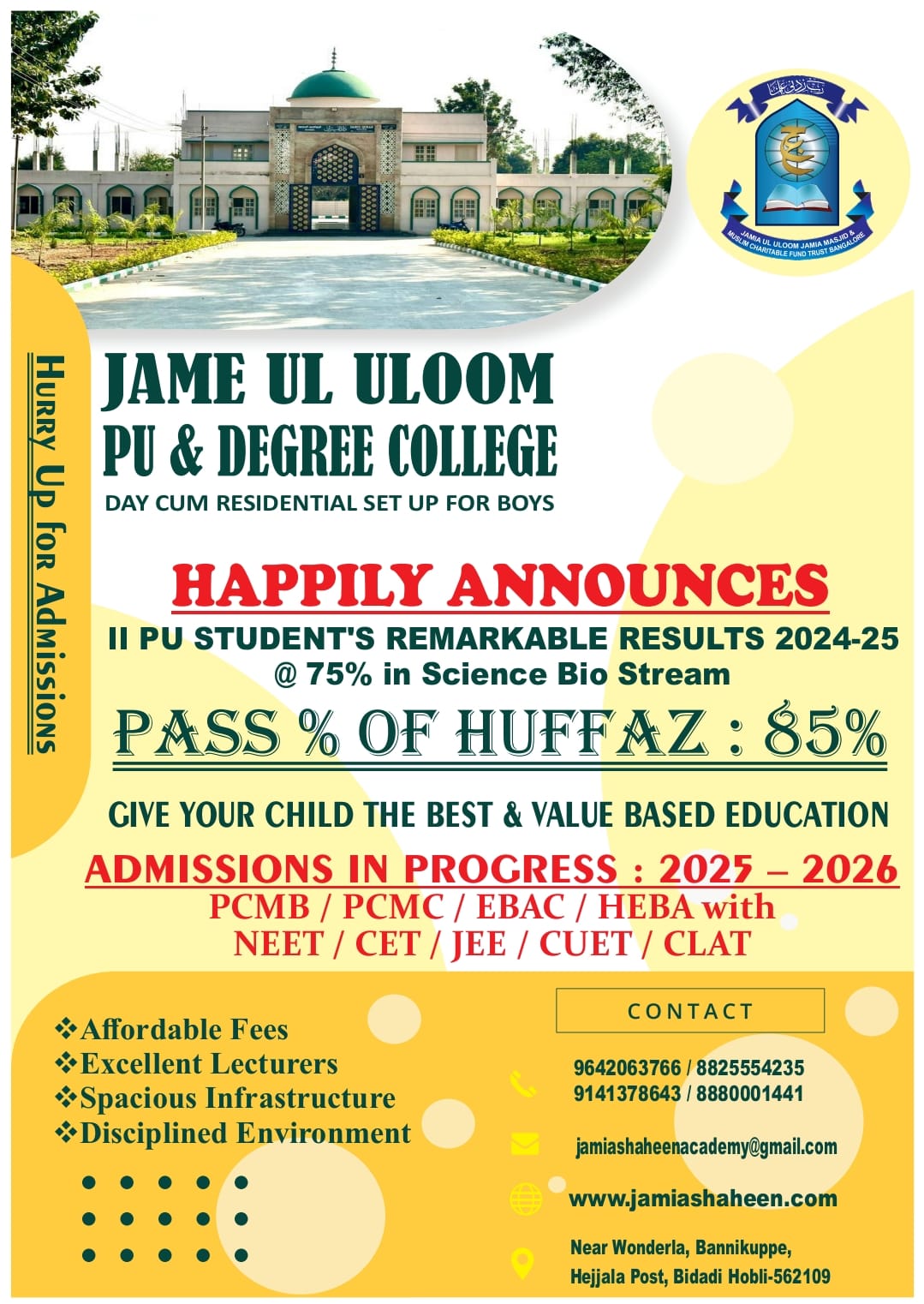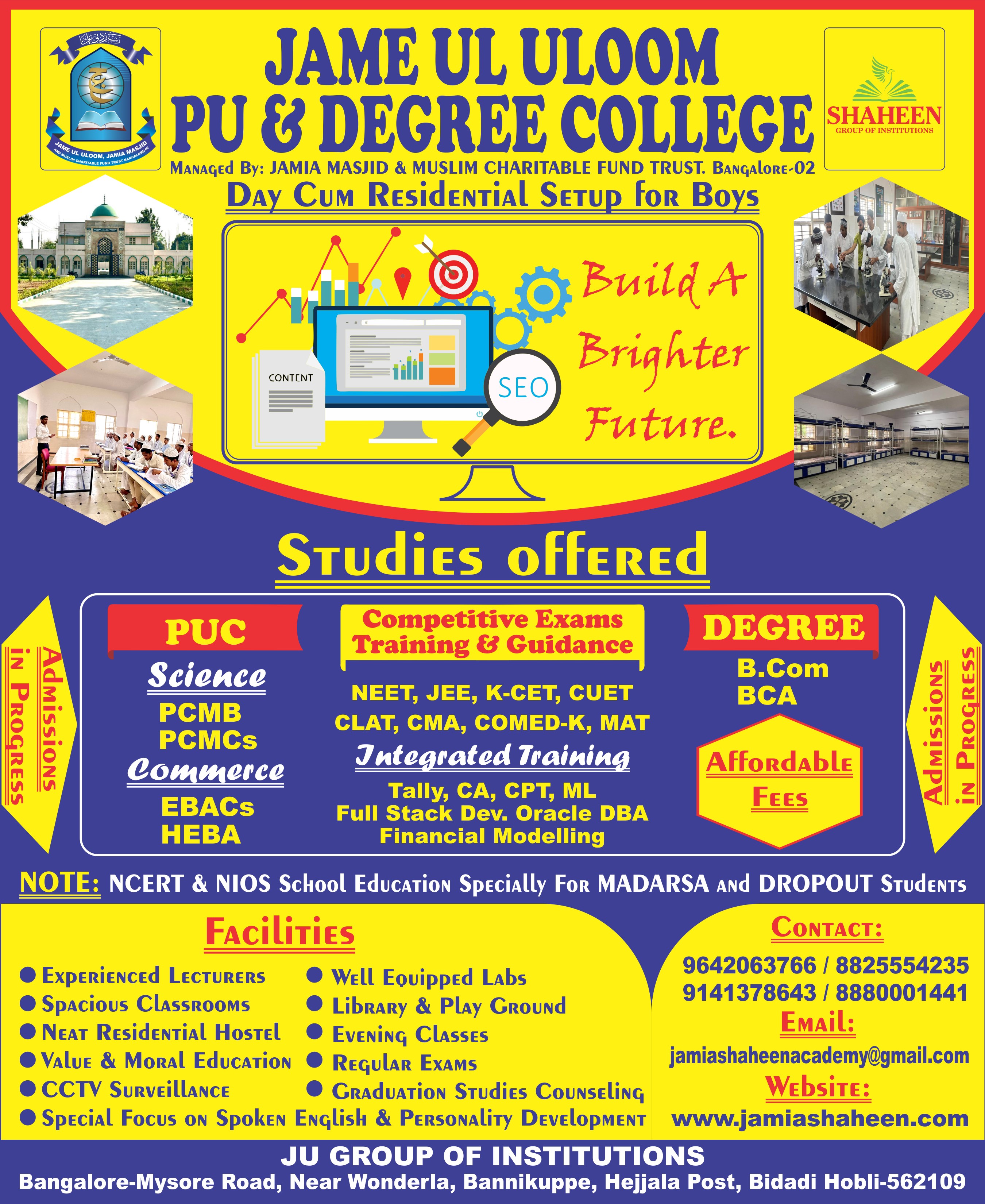 Welcome to Jame ul Uloom Shaheen Academy, a well-designed learning setup that aims to open up school and higher education prospects for '7th+ and 10+2 class/Hafiz-e-Quran/Aalim students'. Associated with the historical Jamia Masjid Bangalore, JSA has been systematically working to impart education among teen and youth aged 13 to 23 years and gradually increase their potential to compete for higher education.