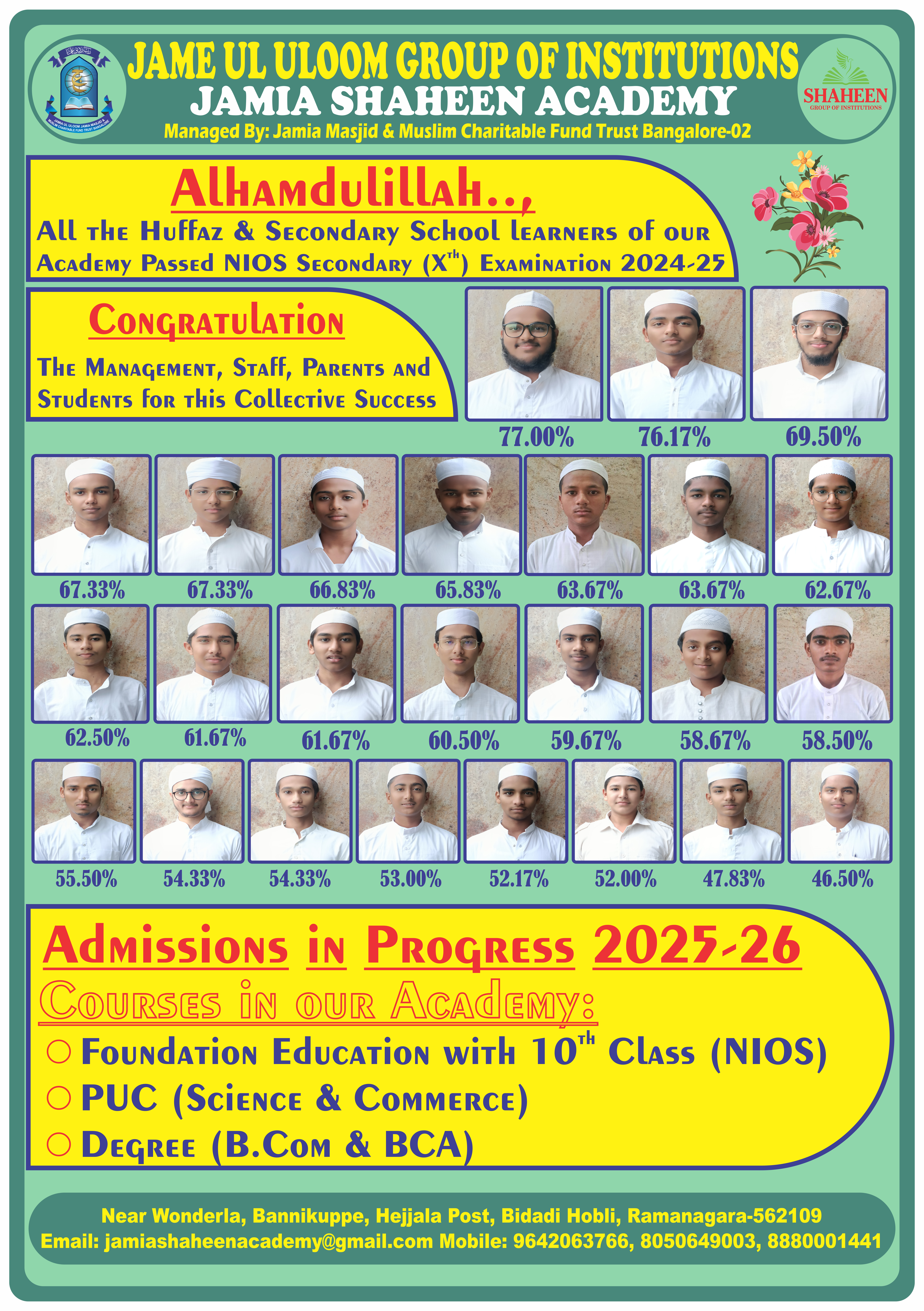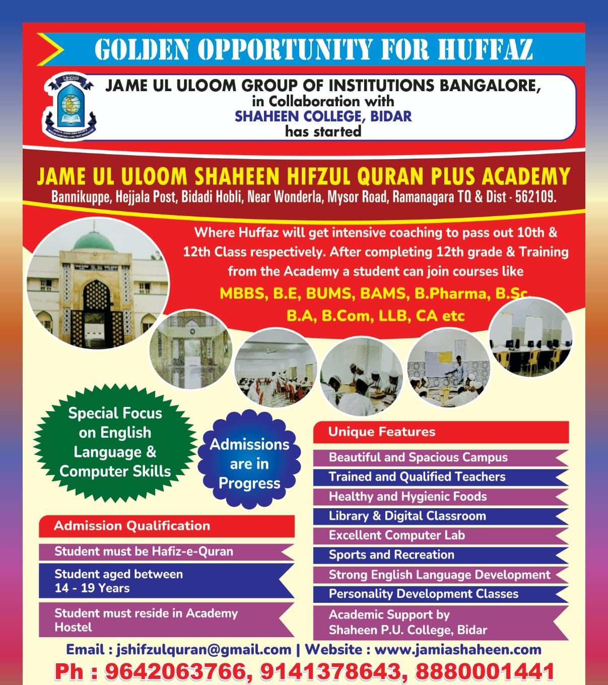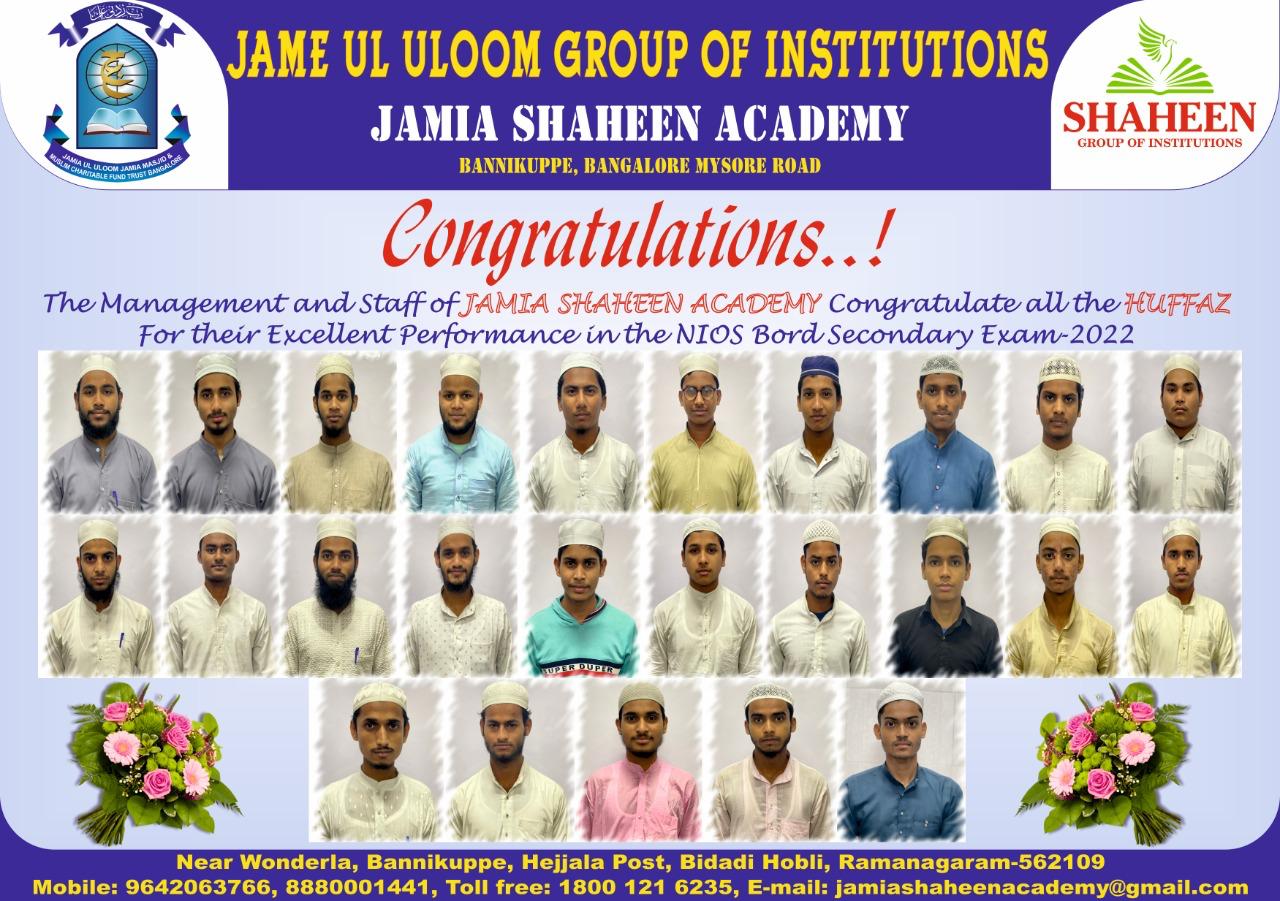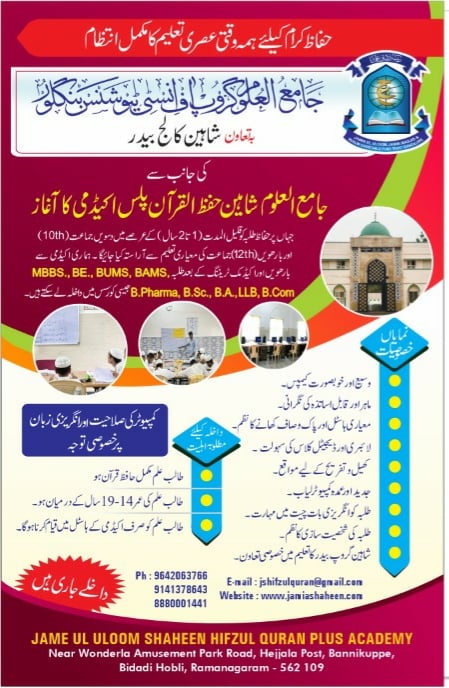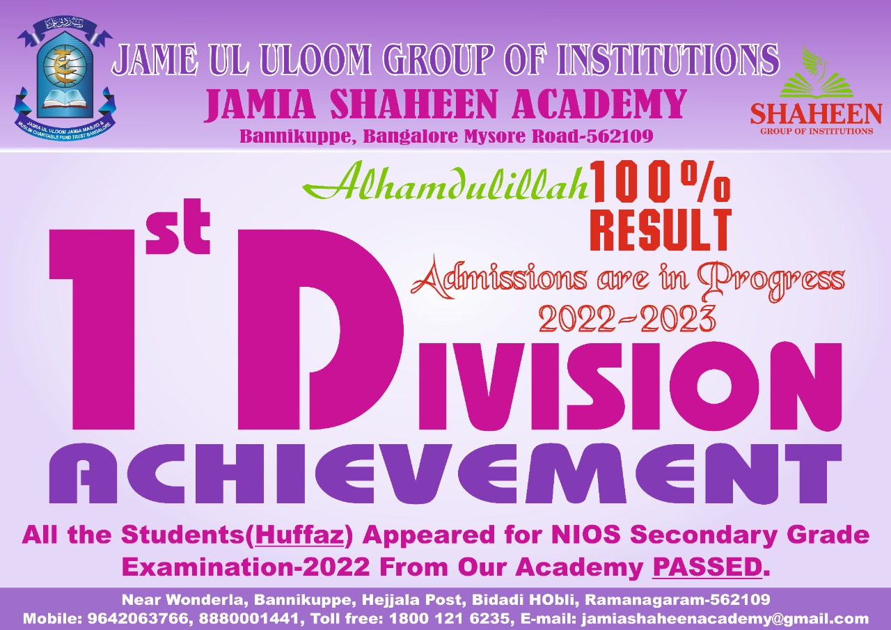 The Academy provides a peaceful learning environment on its well-furnished campus, committed to serious coaching efforts under experienced teachers and instructors. We aim to cultivate a comprehensive academic program fully compliant with the NIOS, SSLC, PUC Karnataka, and Bangalore University curriculum. In addition to coaching, daily memorization of Quran e Majeed is compulsory for all Hafiz e Quran children.